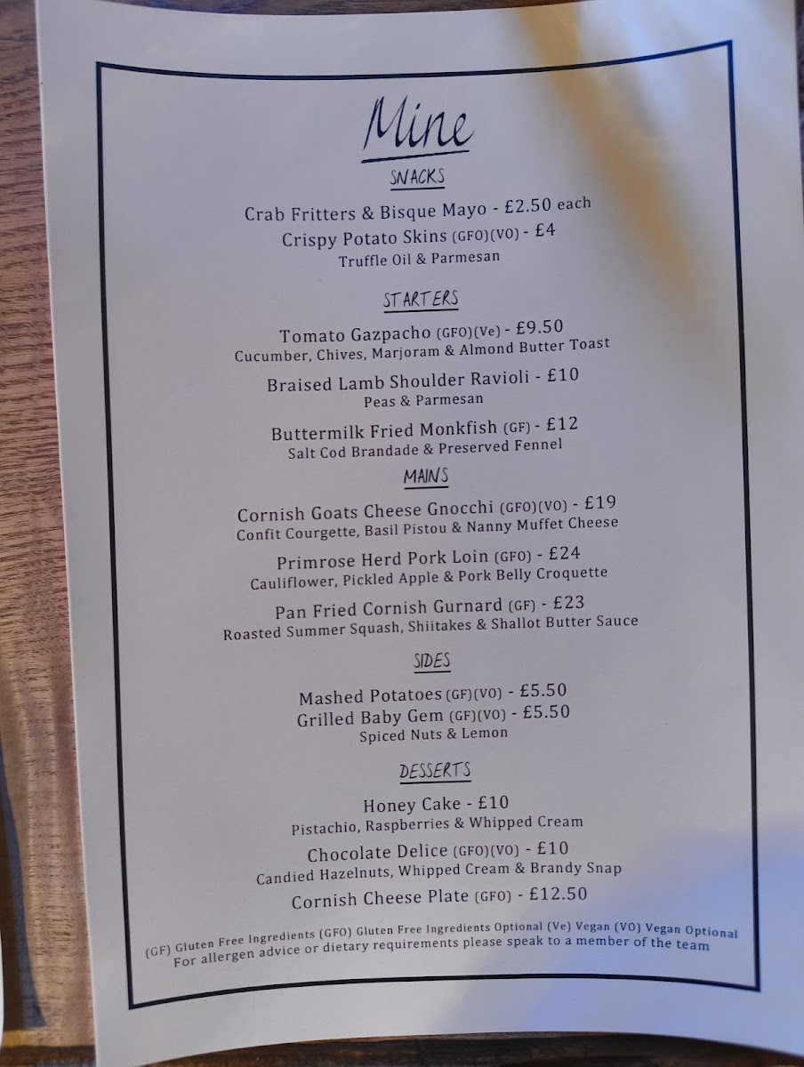 Restaurant Mine, located at 4, The Old Brewery Yard, High St, Falmouth TR11 2BY, United Kingdom, offers a memorable dining experience with a unique menu that sets it apart from other local establishments. The restaurant specializes in a variety of high-quality dishes that combine local ingredients with innovative preparation techniques, offering an exciting twist on traditional British fare.